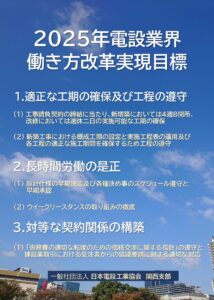電設協 関西支部では、現場での4週8閉所の実施、適正工期の確保や仕様の早期決定などを関係各方面に理解を求めるリーフレットを作成しましたので、関係機関へのご訪問時や打合せの際に、リーフレットをダウンロードいただきご活用ください。