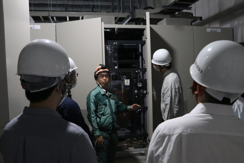 中でも電気室では、送電前ということもあり、受変電設備の内側まで見ることができました。参加者らは、現場を先導した現場関係者の説明に熱心に耳を傾けるとともに、実際の「現場」を肌で感じることができました。