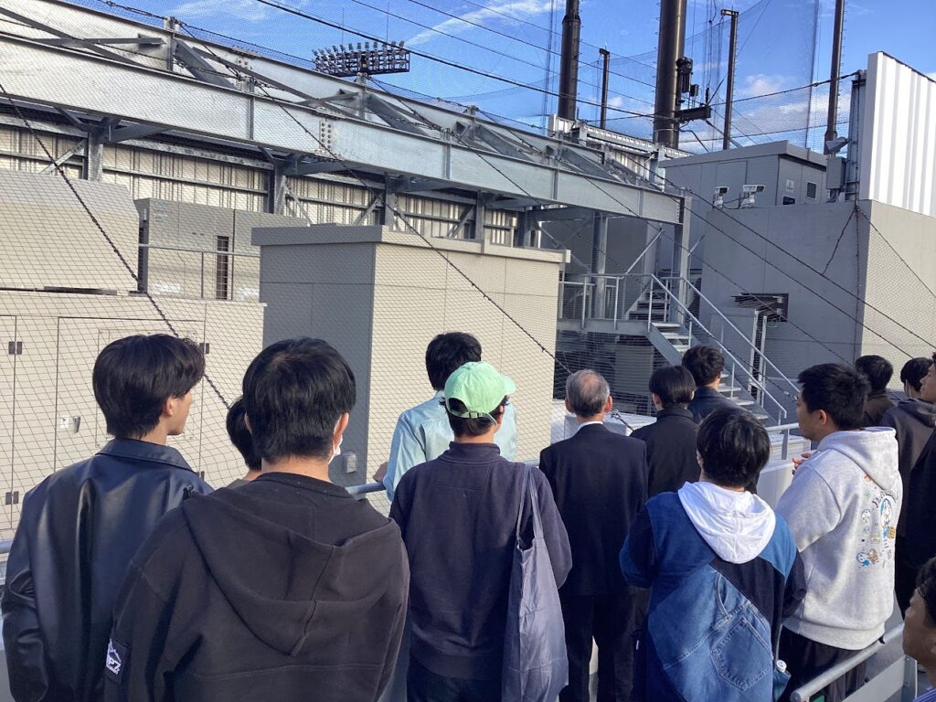 大阪工業大学、摂南大学、大阪公立大学、東大阪高等職業技術専門校の4校11名が参加し、兵庫県尼崎市にある日鉄鋼板SGLスタジアム尼崎(ゼロカーボンベースボールパーク)を見学させていただきました。