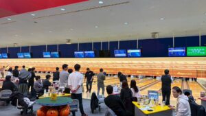開始から賑やかな雰囲気でスタートし、料理をつまみながら歓談を交えてゲームが進み盛り上がっている様子でした。ストライクやスペアが出るたびに歓声など参加者のボルテージが急速に上がり、各チームとも団結した姿が見られました。