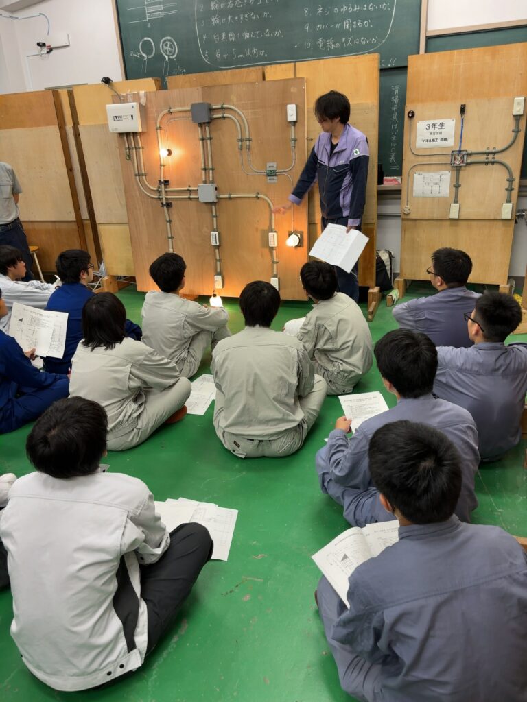 トーヨー電気工事株式会社の主任指導員から、各単位作業のポイントについて分かりやすく説明し、時には厳しく指導を行いながら、講習を進めていきました。